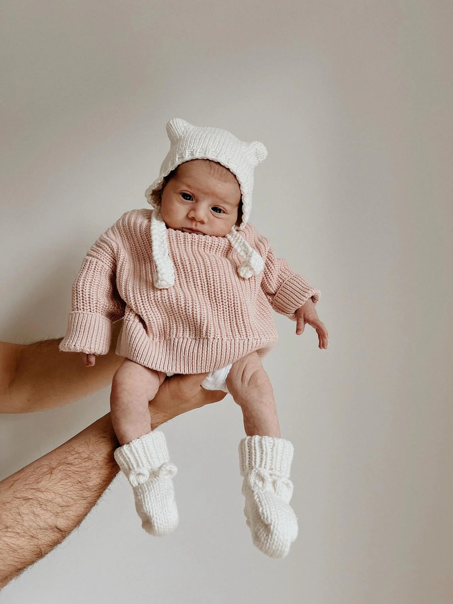 Crafted from 100% organic cotton, these hand-knitted bear ear booties will keep your little one's tootsies warm in style.