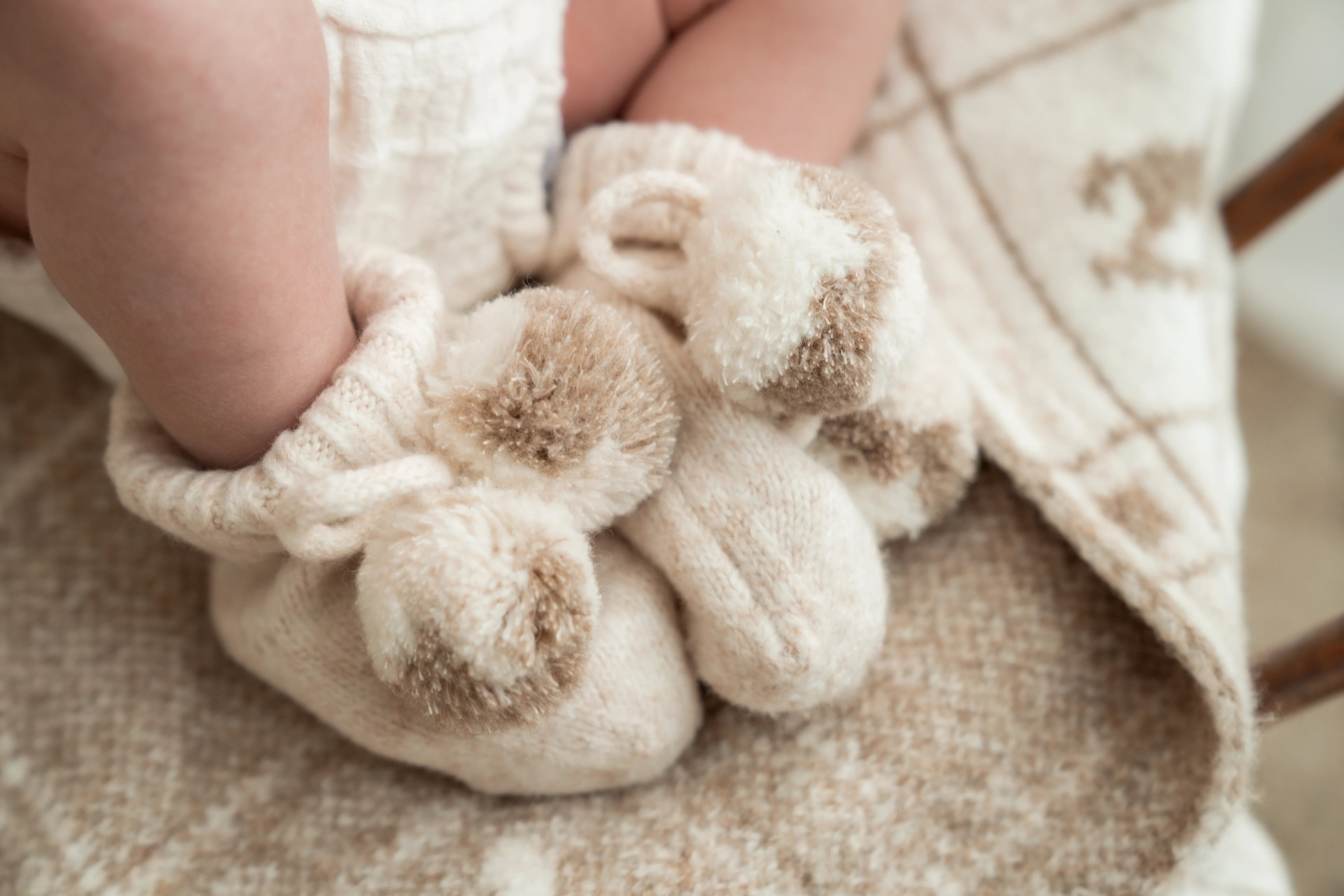 The ribbed fold over cuff and tie up strings, ensures the booties stay securely on and the cute pompoms add a touch of sweetness.