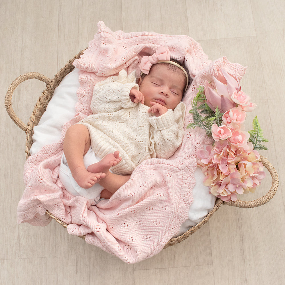 Keep your little one warm and cosy with the beautifully soft bamboo/cotton knit blend heirloom blanket. Featuring a pointelle knit design and delicate knitted lace trim, this light weight, breathable blanket is sure to be loved by carers and baby alike.