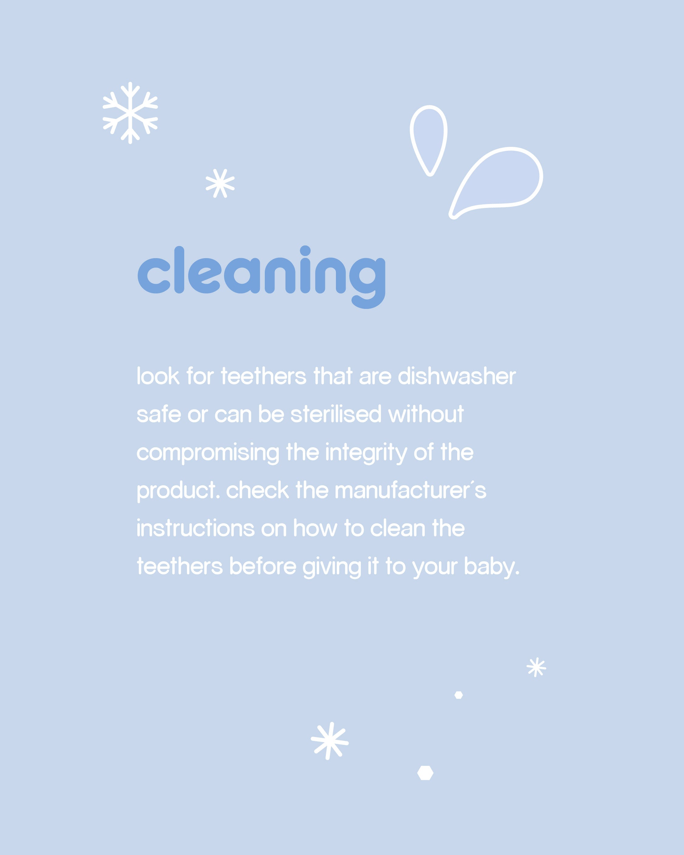 Silicone is textured for varied sensations, providing massaging relief as teething baby chews and explores. And parents are in control of what fills the teethers, no more toxic gels and other nasties. Solid base handle is easy for little hands to grasp from any direction and allows the teether to stay upright when placed on a flat surface keeping it clean and hygienic.