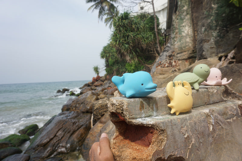Made from sustainable natural rubber from the hevea tree grown in Sri Lanka, My First Ocean Buddies are biodegradable and durable.