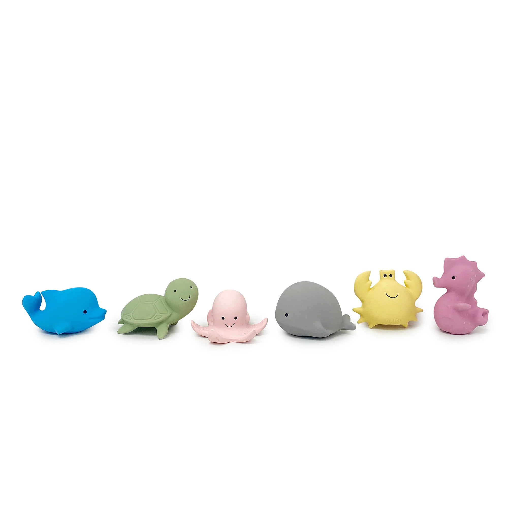 An enchanting sea creature collection of sustainable rubber rattle and teethers provide teething relief and gentle play for the very young. Each marine animal character creates a rattle sound that will provide fundamental lessons in cause and effect while aiding in the development of fine motor skills. These ocean friends make a fantastic addition to bath time or water play, and fully sealed for hygiene.